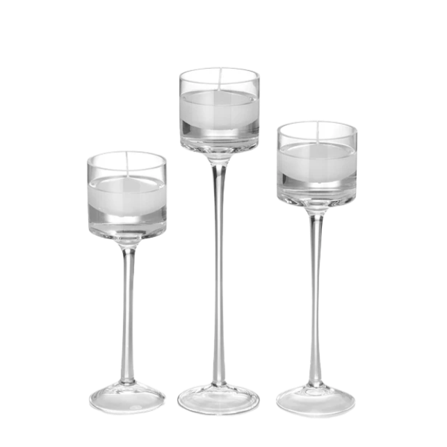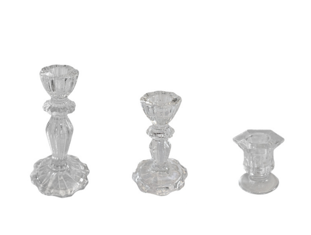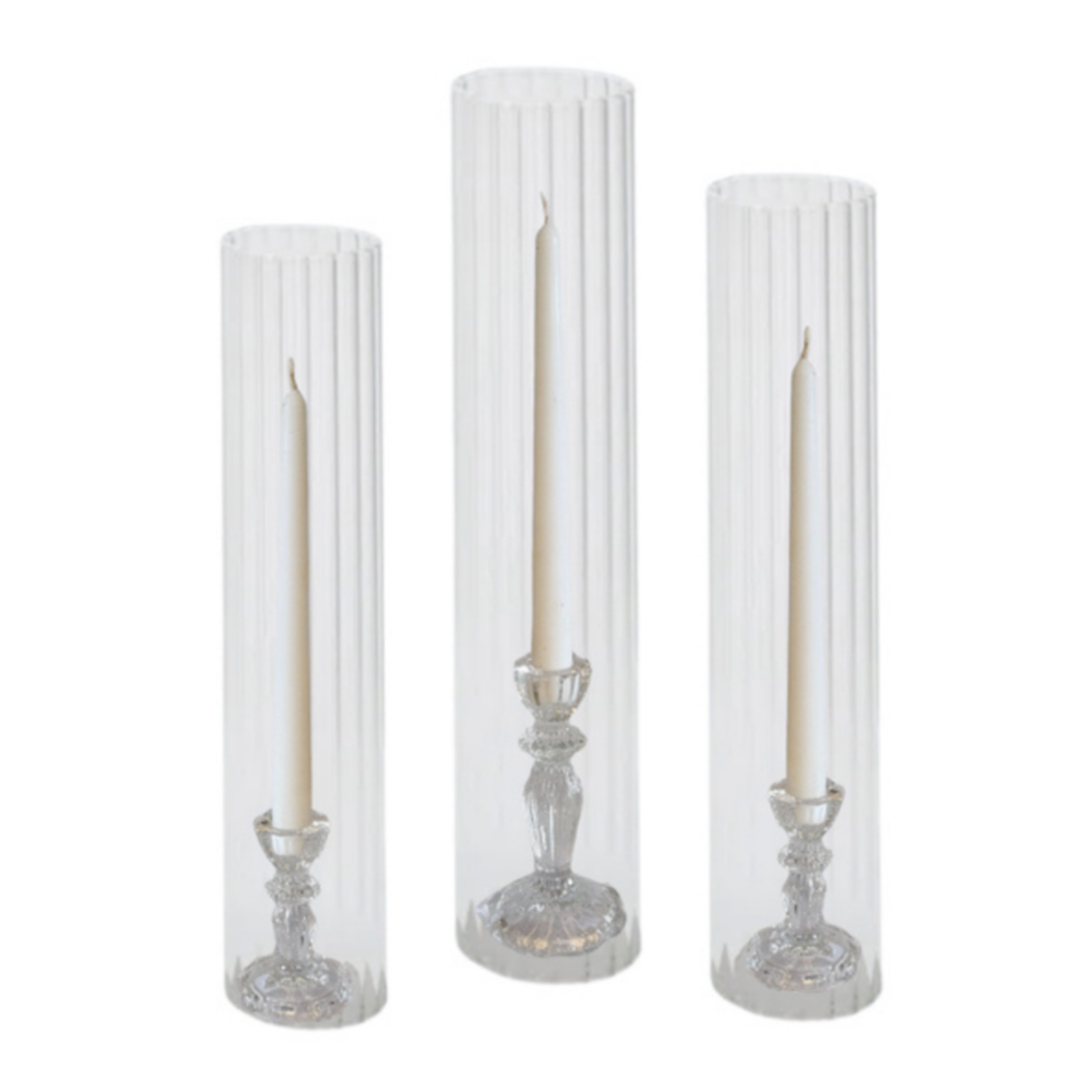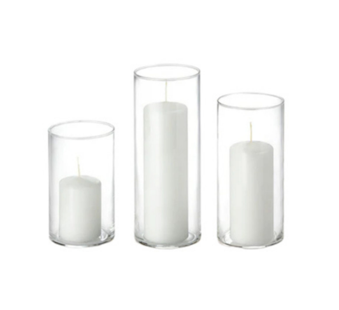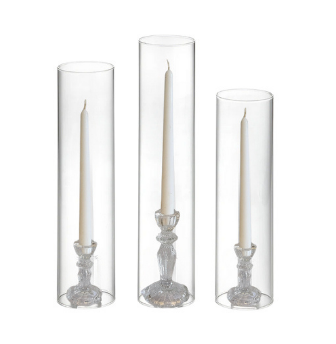 Taper candles come in a set including: holder of your choice, candle, glass chimney and acrylic disc for underneath.